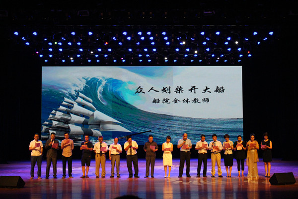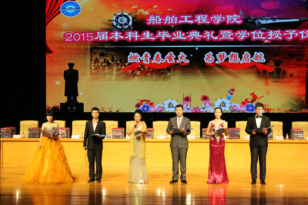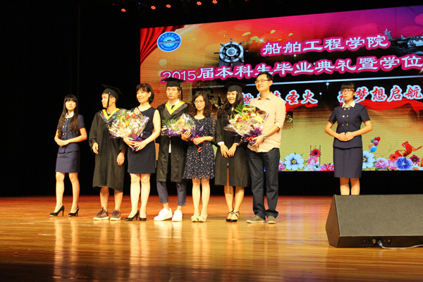 而后,毕业典礼进入晚会阶段。开场视频《再见哈工程》一帧帧唯美画面,唤起了全场同学深深的共鸣。随后进行了歌曲、舞剧、相声,舞蹈等精彩表演。其中,舞台剧《船院24小时》以幽默的语言,夸张的描述,生动地将船院一个普通寝室一天的生活常态展现给观众面前,以此纪念过去的欢乐而美好的大学时光。全场泛起阵阵欢笑和满满回忆。歌曲《给十年后的自己》以饱满的热情唱出了对美好未来的向往与不懈追求。由船舶公司老师们共同演唱的《众人划桨开大船》更是充满热情与力量。老师们的奉献与付出,将永远激励着走向未来的毕业生们。伴随着歌曲《时间都去哪了》动人的旋律,晚会渐入尾声。全场氛围由热烈转为沉静。两位演唱者在歌曲最后表达了对父母的感谢与感恩。