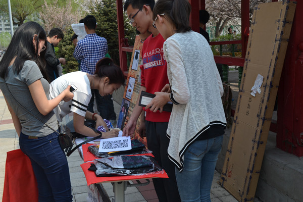 在队长李达及综合部各位部长副部的指导和带领下,小红帽志愿者服务队综合部成员将活动所需的学士服及宣传海报、宣传展架等准备就绪后,12:50在11#楼南侧杏花树下开始租凭活动。