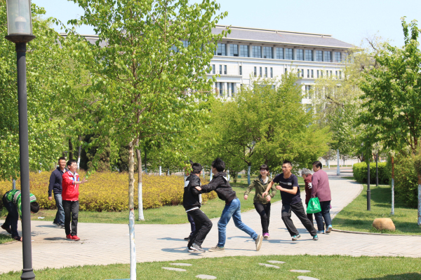 活动中,111班的同学们以寝室为单位分为3个队伍,每个队伍的成员又由抽签决定自己的军衔(军衔:司令,军长,师长,排长,工兵,只有军衔高的可以撕军衔小的)。在前期讲解工作结束后,同学们就开始了 “撕名牌”大战。同学们奔跑于济海湾和员工林之间,展开了智慧与体力之间的较量,班长罗斌是本次活动的裁判兼摄影师,通过相机记录下很多精彩的瞬间。