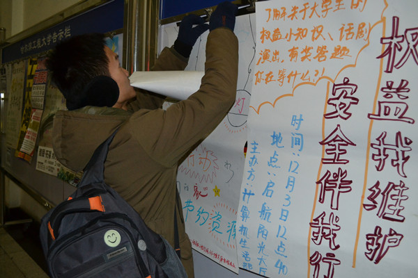 最后,志愿者们来到21b大厅宣传栏张贴此前精心绘制的宣传海报,希望这些海报可以提醒自习的同学们提高环保意识,养成随手关灯的习惯。