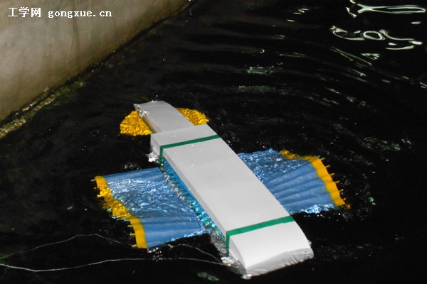 另一个“基于TRIZ理论的水下波动式推进装置”,由公司徐文华、彭玉祥等成员的团队组成。本作品力图用简约的机械传动实现灵活的运动。利用曲柄摇杆机构把齿轮的转动转换为杆的摆动,再让相邻的齿轮之间错动相同的角度,给杆一个初始的相位差,然后用膜把杆包络成曲面。当齿轮转动带动杆摆动时,由曲面形成的翼推动水往与运动相反的方向流动,从而使装置前进。