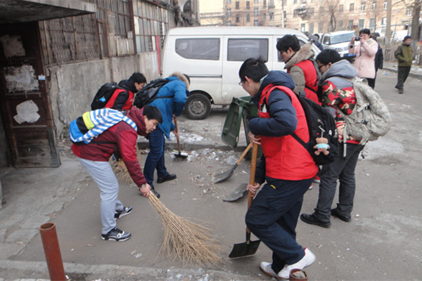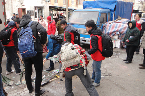 上午九时整,“小红帽”志愿者服务队一行人准时来到红星小区。红星小区属于南岗区比较年久的小区,小区内老式居民楼比较多,同时小区内老年人较多。在和红星小区社区活动中心负责人做了详细的沟通之后,“小红帽”志愿者服务队与20140114、20140115、20150122团支部开始帮助社区居民清理小区道路上的积雪以及垃圾。20140114团支部第一次学雷锋纪念日组织志愿服务活动。同时,社区里不少居民表示,每次“小红帽”志愿者服务队来到红星小区都会有新的面孔出现。
