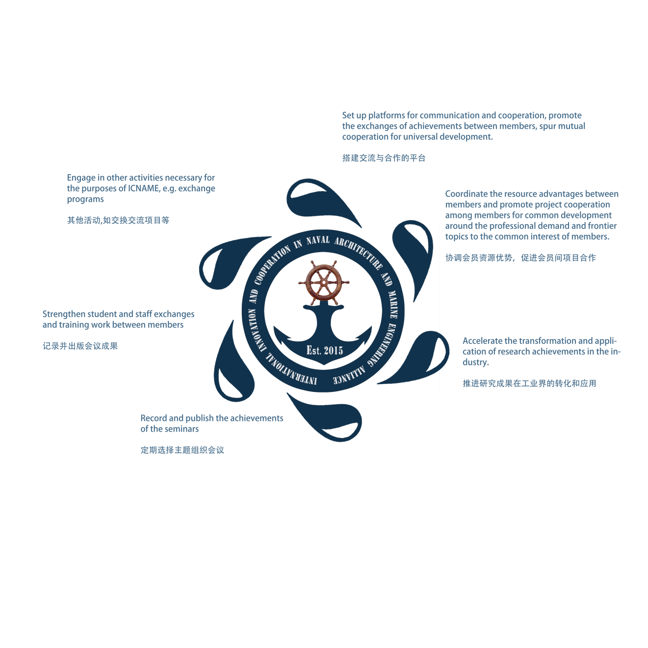 ICNAME is organized exclusively for international cooperation in naval architecture, ocean and marine engineering in the form of promoting mutual cooperation, exploration and exchanges, resource and knowledge sharing and collaborative development among members, with a hope to advance the innovation and development of technologies in naval architecture, ocean and marine engineering as well as the application and translation of research achievements to the marine industry.