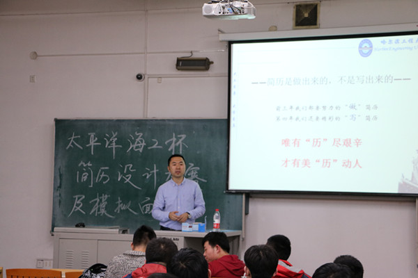 晚6时30分,宣讲会准时开始。首先,杜世欣向到场的同学简单介绍了海工俱乐部的发展历史以及此次宣讲会的主要目的,并号召更多的同学参与到之后简历设计及模拟面试大赛当中去。之后,苏智开始向大家讲授简历设计及面试方面的知识和技巧。苏智在讲解中多次强调:一份好的简历是需要每个人用自己的行动去撰写的,大学三年时间,每一个老员工都是在为自己日后的简历增添不同的东西。此外,苏智还提到了简历撰写时候的一些技巧,如何正确扬长避短,得到面试企业的青睐。正值面试季刚过,苏智为大家带来了简历制作优秀的作为模板,针对其中的亮点及不足进行了现场点评指正,帮助同学们进一步了解简历制作方面的技巧。
