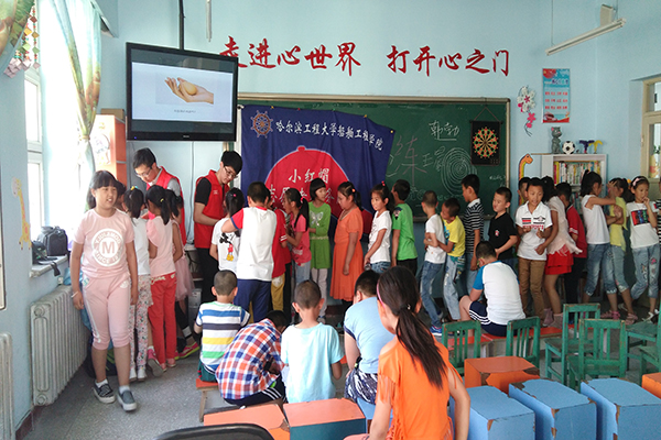 6月7日下午,小红帽志愿服务队一行三人来到位于香坊区的通乡小学,给这里的孩子进行每周一次的七彩课堂活动。本次活动由小红帽实践部部员何庆港组织带队,20140111团支部参与此次活动。