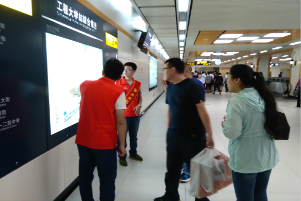 到达地铁站,志愿者们首先与值班站长进行了沟通交流。然后开始准备活动需要的桌子和衣服,准备完毕后便开始了本次引导工作。本次志愿服务分成两组,三名志愿者站在出站口旁,指引来往的乘客安全有序出站;另外三名志愿者站在地铁站的地图旁,为不了解地形的乘客指路,尽量让乘客们迅速高效的到达目的地。活动结束,志愿者们收拾好器材并将其归还给值班室后,返回公司。