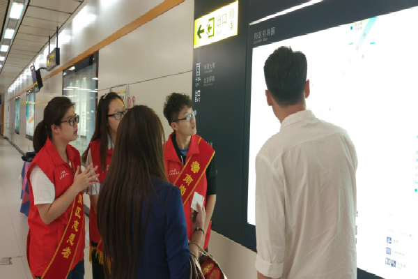 上午8时30分,领队志愿者徐杨、牛奔首先与值班班长进行了沟通交流,然后开始准备活动需要的桌子和衣服。准备完毕后,便开始了本次志愿服务。本次活动分为两组,一组由牛奔带领,在地铁站地图旁,为不了解地形的乘客指路。另一组由徐杨带领,在出站口引导乘客安全有序出站。