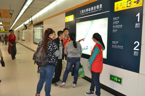 上午7时30分和下午4时30分,小红帽志愿服务队公益部副部徐杨、任建宇分别带领20150115、20150117班团支部来到哈尔滨地铁工程大学站开展志愿服务,在与站长简单交流后,志愿者们进入地铁站内,徐杨和任建宇将团支部的同学们分为三组,每组同学都站在自己岗位上进行志愿服务。其中两名志愿者站在地下二层出口处,组织出口乘客的纪律,保障地铁交通有序进行;一名志愿者站在地下一层中心位置,为有疑问的乘客联系地铁工作人员,解决问题;其他志愿者站在地铁出口的地图旁,为不知方向的乘客指路。