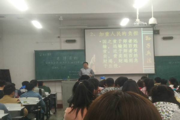 讲座中于凡老师重点介绍了孙子针对战争如何取胜而提出的36计,讲了孙子的战争观以及孙子所遗留的军事思想对当今人们应对战争所起的指导作用。于凡老师在讲到孙子的战争观的时候还结合了当今局势,告诫大家要保持头脑清醒,呼吁同学们不要受网上一些过激言论影响。讲到这里的时候于凡老师从网上摘来的一首愤青的打油诗将讲座的气氛推向高潮,全场同学开怀大笑。于凡老师还带领同学们分别从攻与守的角度论证了孙子的“战争宜速战速决”与毛泽东的“持久战”的正确性。