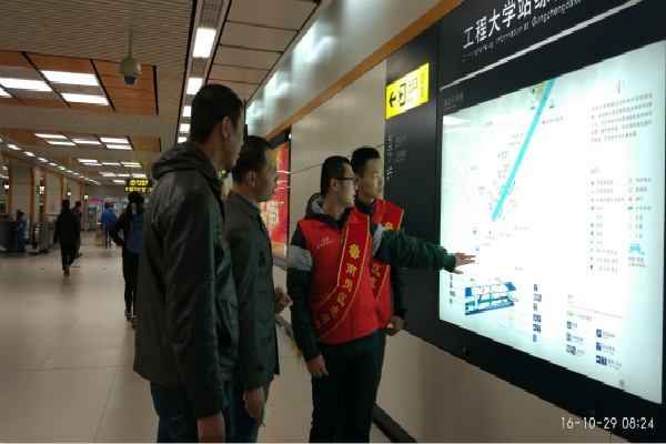 上午7点30分,下午4时30分,小红帽志愿者服务队公益部副部牛奔和任建宇分别带领20150111、20150117班团支部来到哈尔滨地铁工程大学站开展志愿服务,志愿者们进入地铁站内后先与站长进行了简单的交流,然后将团支部的同学们进行了分组,每组同学站在自己岗位上进行志愿服务。其中两名志愿者站在地下二层地铁出口处,组织出入乘客的纪律,保障地铁交通有序进行;两名志愿者站在一层中心位置,为有疑问的乘客联系地铁工作人员,解决问题;两名志愿者站在地铁出口的地图旁,为不知方向的乘客指路。