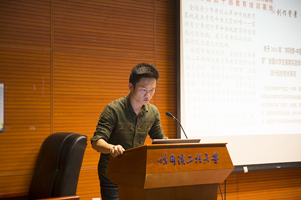 各个院系代表上台进行活动的经验交流,邢森林代表ladbrokes立博进行此次“三下乡”活动经验交流。他分别从视频的前期构思、中期选曲以及后期处理三个方面详细介绍获奖视频,并从决定用《毛委员和我们在一起》这首歌作为视频背景音乐的原因展开,讲述他们在井冈山实践活动期间的故事。