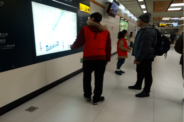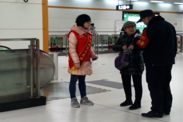 志愿者们在逸夫楼门前集合,一同前往地铁站,在去的路上,志愿者们询问工作流程,并选定好分组工作。到达地铁站后,志愿者们穿上服装,站在自己的位置上。志愿者们分成三组,其中两组同学分别站在出站口处,提醒行人站在黄线外,安全通过出票口,并帮票证出现问题的行人联系站内工作人员;另一组同学站在交通引导牌下,为出站的乘客指路。