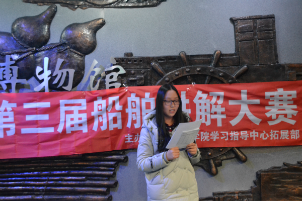 通过初赛的层层选拔,一共有12位同学脱引而出,进入了决赛。选手们根据赛前抽签,为船舶博物馆内5个板块,按次序单独进行讲解。比赛现场同学们激情饱满,用铿锵有力的声音和精准到位的文字对十大名船进行了讲解。在讲解结束后,校讲解团副团长兼船舶馆培训中心主任吴智勉对选手们的表现进行了一一点评。最终,20160113班的张硕以优异的表现获得了评委们的一致肯定,成为了本次比赛的第一名。