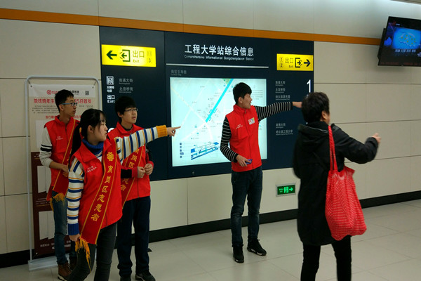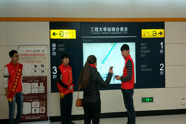 上午8时,下午4时30分,小红帽志愿服务队实践部副部刘洋、公益部副部牛奔分别带领20150122、20150115班团支部来到哈尔滨地铁工程大学站开展志愿服务,志愿者们进入地铁站内后,先找到站长并进行了简单的交流,将桌子搬到地铁站导航地图附近,换上志愿者服装,然后进行分组;每组同学站在自己岗位上进行不同的志愿服务。其中有的志愿者站在地下二层出口处,组织出口乘客的纪律,保障地铁交通有序进行;有的志愿者站在自动售票机旁边,帮助乘客更方便的买票;其他志愿者站在地铁出口的地图旁,为不明方向的乘客指路。