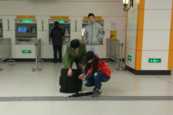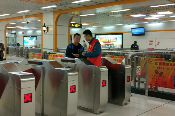 上午8:00,牛奔、任建宇带着20160116、20160112团支部来到地铁站,在报道之后开始本次的志愿活动。每队的志愿者由四个人组成,分别对应着两个自动售票口与两个出站口。位于售票口的志愿者帮助指导乘客购票,做到“有序购票,安心进站”。位于出站口的志愿者,协助站内工作人员进行人流的疏通,帮助解决一些票证问题以及为出站的行人指路。