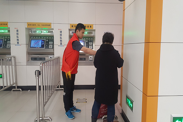 两团支部分别在小红帽公益部副部牛奔和实践部副部彭钰皓带领下准时来到工程大学地铁站,在站长的指示下四位志愿者到达自己的工作岗位。两个人在出站口,为乘客解决卡票的问题。两个人在自助售票处为不会买票的人提供帮助。同时志愿者们负责向不熟悉周围环境的人提供指路的服务。
