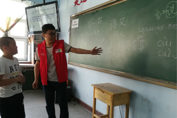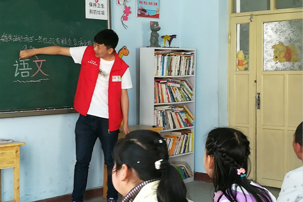 到达小学后,在孩子们坐好之后,志愿者开始本次的授课。本次授课的主题是趣味语文。志愿者在黑板上写上“语文”两个字,让孩子们上台来写各种字体的“语文”,讲述“语文”的含义,开始接下来的讲述。在课堂上,志愿者和孩子们玩成语接龙,并进行“你画我猜”的活动,增强对课上所学成语的认识。