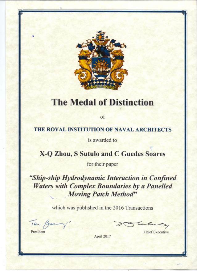 近日,英国皇家造船工程师学会公布2017年“卓越奖章(Medal of Distinction)”获奖名单,公司周学谦副教授和葡萄牙里斯本大学船舶与海洋工程技术中心S Sutulo教授和C Guedes Soares教授于2016年合作发表在《International Journal of Maritime Engineering》的论文《Ship-ship Hydrodynamic Interaction in Confined Water with Complex Boundaries by a Panelled Moving Patch Method》获奖。