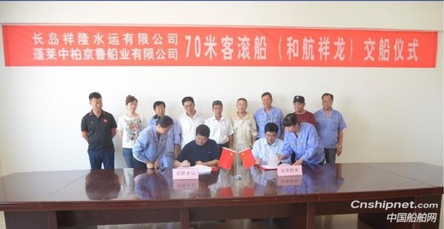 9月21日上午,由蓬莱中柏京鲁船业有限公司为长岛祥隆水运有限公司建造的70米客滚船—“和航祥龙”圆满交船。烟台和隆(航运)集团巩革董事长与京鲁船业王轰董事长分别代表双方在交船协议上签字,祥隆水运驻京鲁船业代表庞贤乐、中国船级社代表肖楠及京鲁船业相关人员等见证了此次交船仪式。