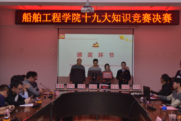12月18日晚6点半,ladbrokes立博在船海楼313教室举办了“”十九大“”知识竞赛决赛。参加本次活动的有公司党委副书记郭践实,辅导员王超、宋卫国,以及进入决赛的ladbrokes立博各党支部。水利工程党支部以优异的表现获得了第一名。