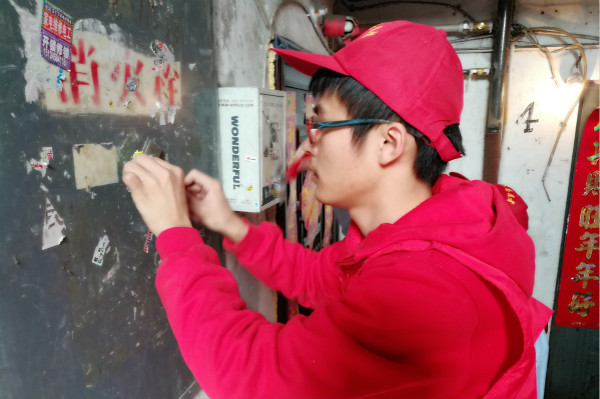 4月18日下午,小红帽志愿者服务队在红平社区开展了清除小广告的活动,本次活动由小红帽志愿者服务队公益部副部长刘靖带队,共有6名同学参加了本次活动。