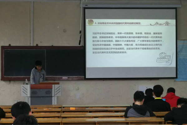 下午两点三十分,活动准时开始,本次活动由三个班级共同举办,到场的同学人数众多,同学们热情高涨。活动主要由主持讲解的形式完成,讲解的内容分为四部分,分别为:“七二”讲话精神介绍,中国共产主义青年团第十八次全国代表大会内容简介,简要学习共青团章程和回顾共青团历史四个部分。在中国共产主义青年团第十八次全国代表大会胜利闭幕之际,中共中央总书记、国家主席、中央军委主席习近平同团中央新一届领导班子成员集体谈话并发表的重要讲话是指导新时代青年和共青团工作、推动新时代中国青年运动的纲领性文献,是全团工作的根本遵循。