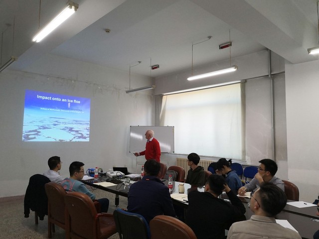 英国东安格利亚大学是英国一流学府,也是全欧洲乃至全世界最重要的科研中心之一。Aleksandr Korobkin教授在流体与结构物相互作用方面取得了非凡的成就,得到国际社会的广泛认可,于2009年获得了著名的船舶流体力学最高奖项“温布洛纪念讲学奖(Weinblum Memorial Lectureship)”,Tatyana Khabakhpasheva副教授在冰水动力学的研究成果丰富,发表顶级学术论文以及期刊论文100余篇。在本次讲坛中,Aleksandr Korobkin 教授和Tatyana Khabakhpasheva副教授对分别对“冰道中的水弹行波”、“动载荷或水下运动物体产生的水弹行波”、“波与垂直圆柱体的相互作用”、“水与碎冰的碰撞”、“进出水问题的半解析模型”、“从水面快速提升圆盘的实验与理论”等相关问题进行交流报告,解答了员工们对于流体与结构物相互作用、冰水动力学、水弹性波等方面的相关问题。