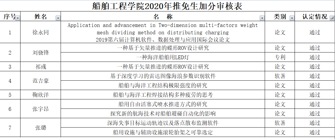2019年9月17日16:00,公司推免工作小组在船海楼316对申报2020年推免生的员工进行学术加分问辩审核,审核内容包括学术论文、专利、软件著作权,经公司推免工作小组审核,对以下员工的学术成果予以认定加分,现对结果予以公布。