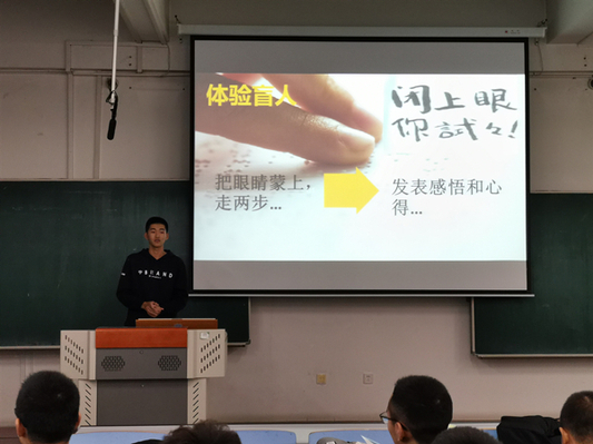 2019年11月14日,20190100班和20190112班全体成员于21B308教室,开展了主题为“关爱盲人,保护眼睛”的团体活动。