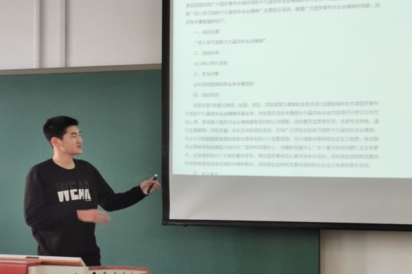在团支书李林介绍了活动基本流程之后,同学们首先基本了解了什么是党的十九届四中全会,对会议的意义和重要性有了一个基本的认识。随后,李林同学为同学们深入讲解了党的十九届四中全会做出的决定及这些决定背后的意义,让同学们感受到了党的十九届四中全会的精神与思想。最后,同学们一同观看了有关党的十九届四中全会的视频,知晓了国家主流媒体对本次会议的意见与看法。