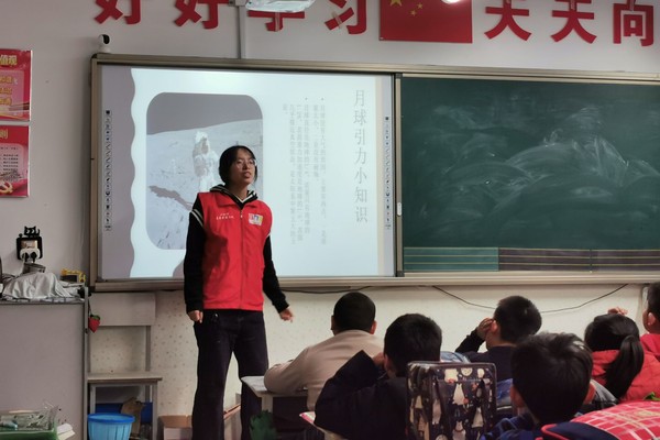 讲述月球的引力时,志愿者用地球作对比,形象生动地描述了月球引力有多小,并且还讲解了月球引力对地球的影响——引发潮汐,小朋友们积极提出问题,志愿者一一耐心解答。