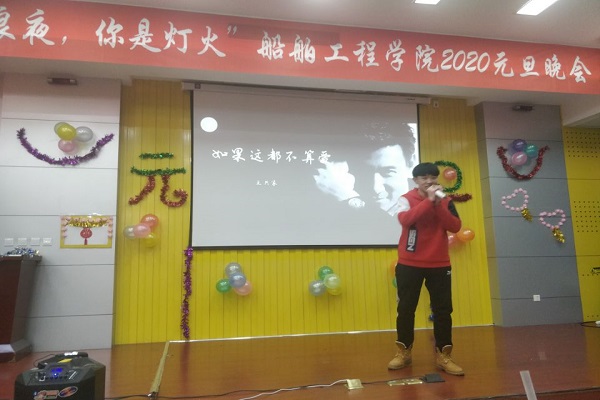 2020年元旦晚会在晚18:30正式开幕,前来观看的同学们积极参与互动,现场气氛热烈。在主持人徐温涛同学和刘方晗同学的介绍下,王兴家、石广洲等同学为大家带来歌曲《如果这都不算爱》、相声《无题》等节目,场内掌声连连,获得了老师同学们的一致好评。在晚会的最后,节目组为现场的同学们放送了由员工会办公室制作的惊喜视频,代表辅导员宋卫国老师向同学们致以了新的一年的祝福,全场气氛由此达到最后的高潮。晚9时许,晚会在现场同学们的欢声笑语中落下帷幕。