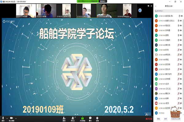 5月2日下午14时,船舶公司20190109班于瞩目平台上开展线上学子论坛活动。出席本次论坛的成员主要包括员工会生活权益部部长周健、副部长付清阳以及20190109班全体成员,本次会议由周健主持。
