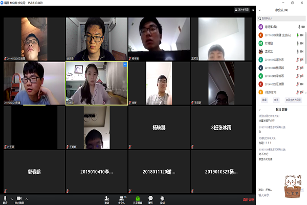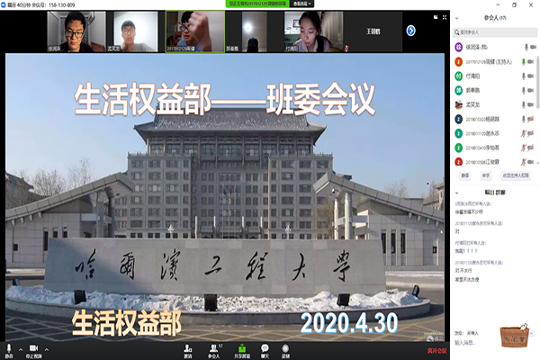 2020.4.30晚21:30船舶公司生活权益部及2019级全体生活委员在瞩目平台召开生活权益部班委会议。出席此次会议的有生活权益部部长:周健,生活权益部副部们,以及2019级全体生活委员。