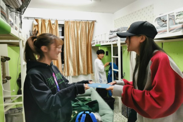 2020年10月8日晚,ladbrokes立博员工会安排相关人员进入新生寝室将前期征集到的家长寄语和学长学姐寄语发放到各位新生手中。