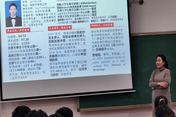 管明阳等人分别从如何培养自身学习能力、提高学习效率,如何组织团支部活动,如何合理规划学习生活等方面,结合自己的学习生活经历和优势,分享自己的学习方法。20200103和20200110班同学向管明阳,刘逸飞,霍帅文和刘子琪提出问题。同学们围绕自身学习经历询问克服疲惫的方法。管明阳解答说:“同学们都应自己找到自己的快乐源,定准目标,才能有动力学习。”关于目标的确定,他解答说:“在前进过程中,如果发现问题,应优先解决这个问题,思考问题产生的原因,将其作为当前目标来解决。”