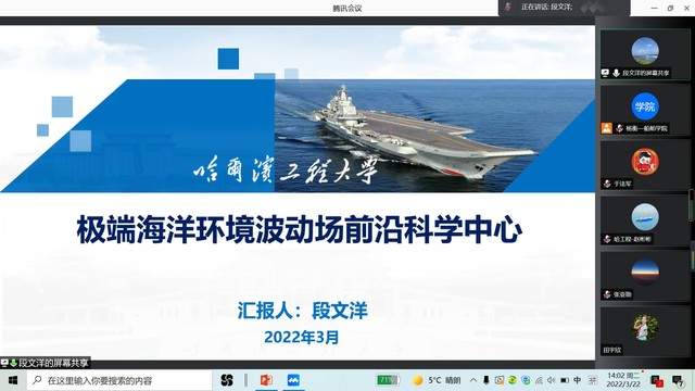 为落实公司“十四五”规划方案中牵引性战略任务“极端海洋环境波动场前沿科学中心”、推进公司2022年重点工作“有组织推进创新平台内涵建设与发展”,3月22日,公司举办首场创新平台专题报告会,邀请工学学者段文洋教授作专题报告。会议采用线上形式召开,公司领导班子、基层学术组织负责人、公司及青岛创新发展基地教师等110余人参加会议,副经理孙龙泉主持报告会。