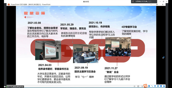 会议中,首先由各班团支书围绕组织建设、思想引领、公益实践、创新创业、学业发展等五个方面进行PPT展示和陈述。最后姜玥根据答辩情况对组织建设、思想引领、公益实践、创新创业、学业发展等五个方面进行总结。