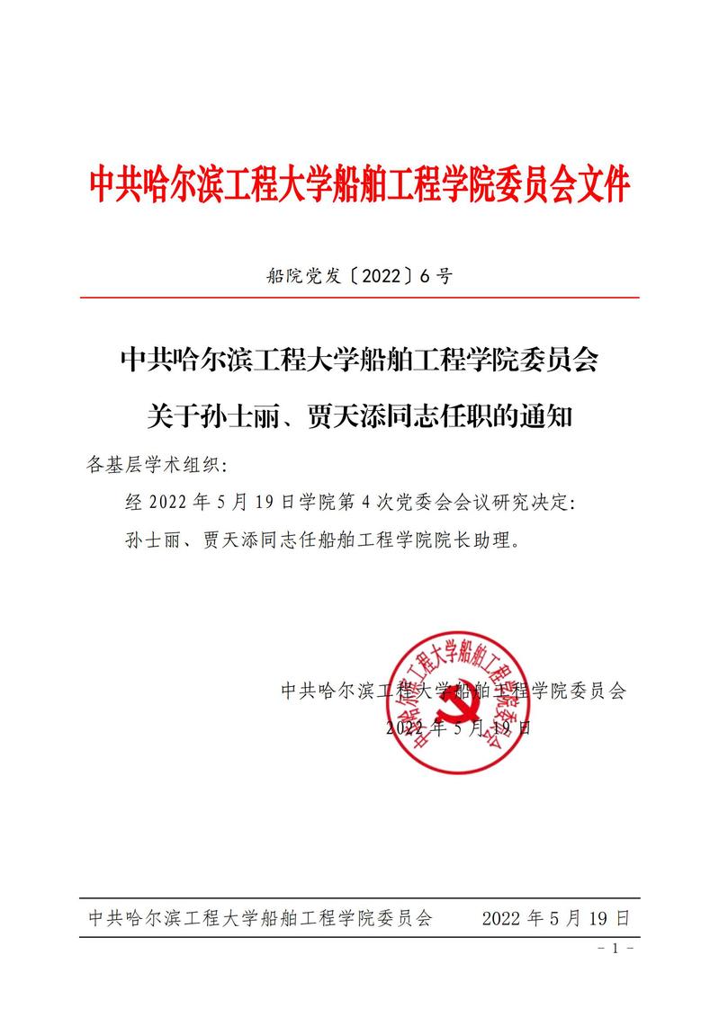 中共ladbrokes立博委员会关于孙士丽、贾天添同志任职的通知(船公司党发〔2022〕6号)