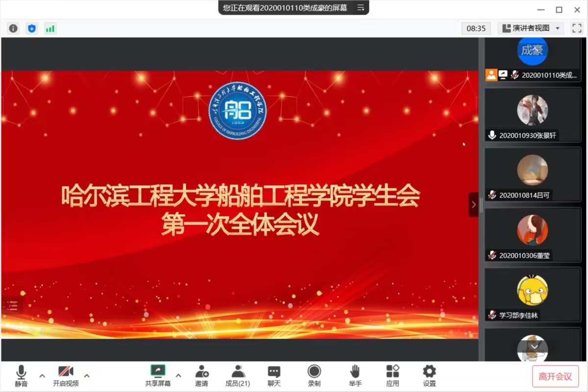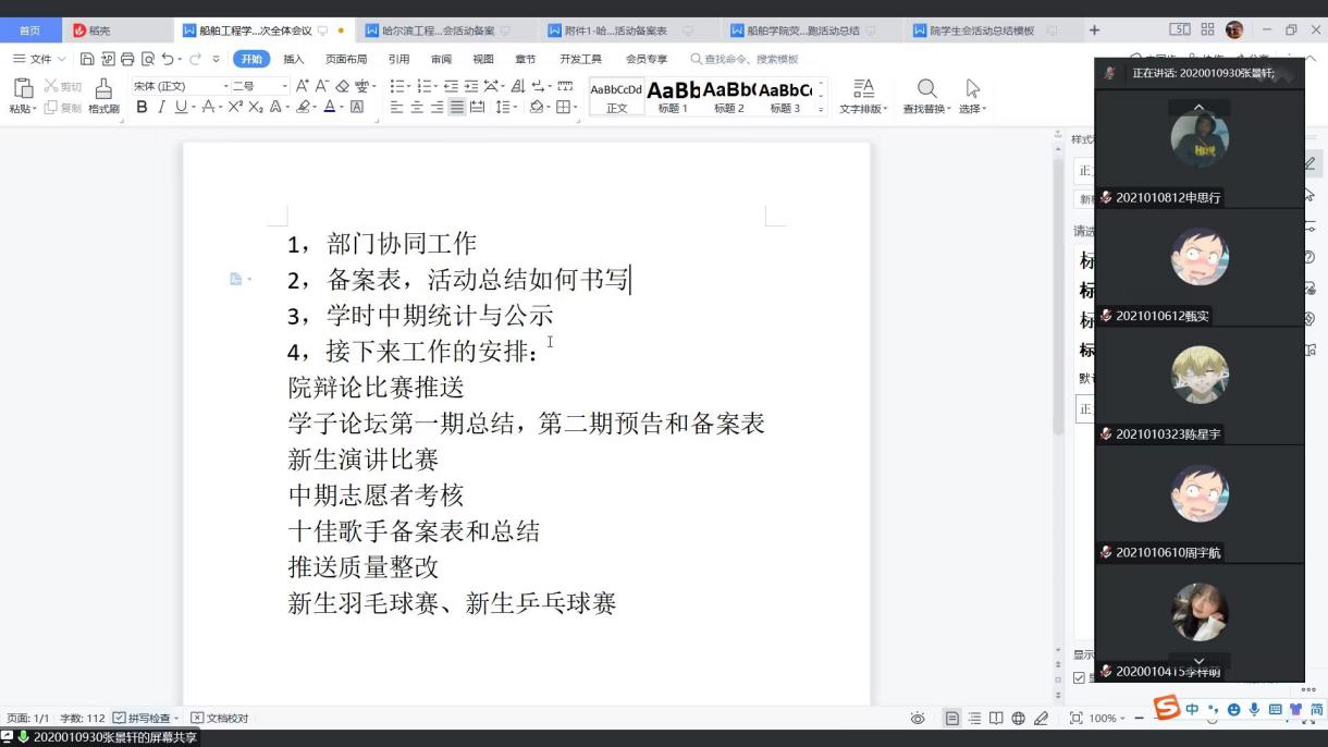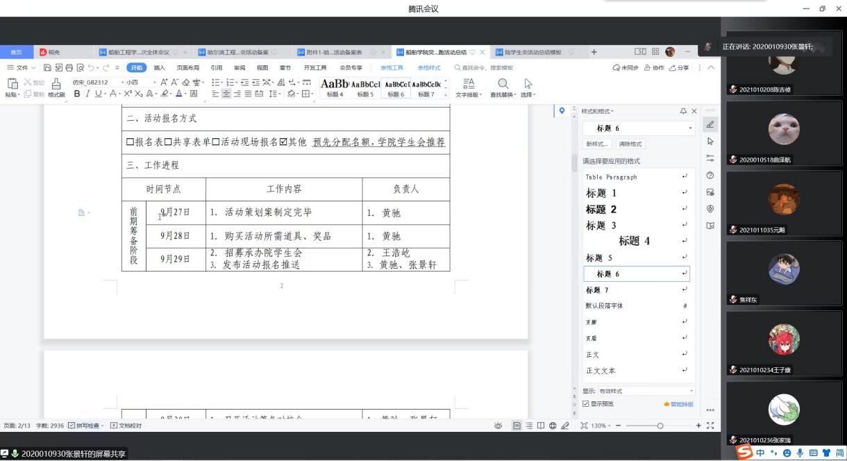本次活动以线上腾讯会议的形式展开。会议主要内容为各部门负责人讨论完善部门间有序协调的模式、员工会执行主席张景轩规范备案表和活动总结的标准格式,相关部门进行学时中期统计与公示。