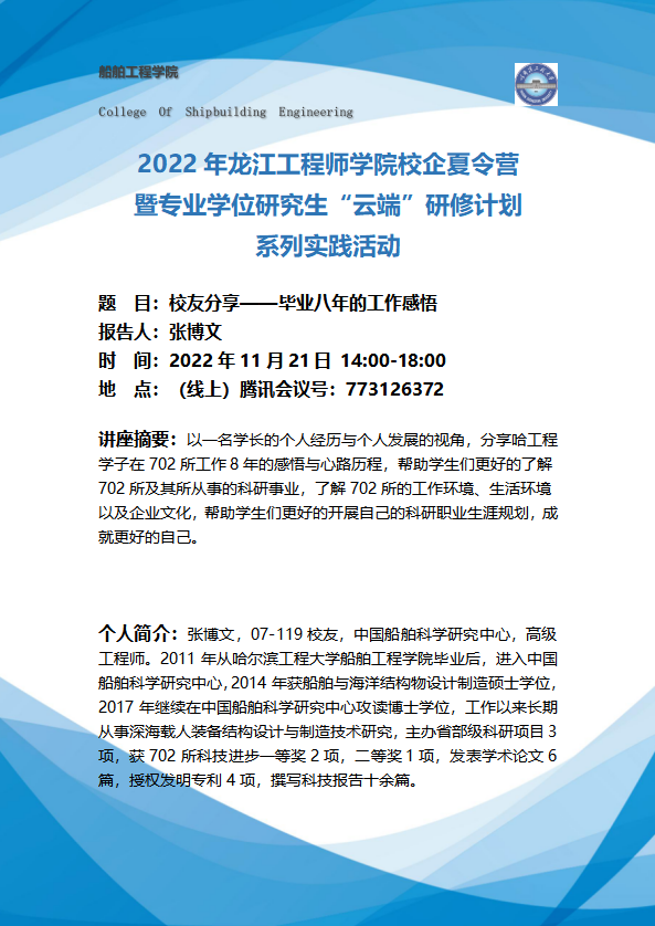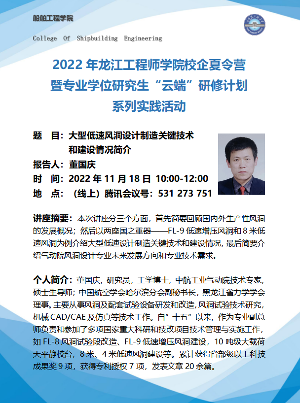 11月18日、21日,ladbrokes立博成功举办了2022年龙江工程师公司校企夏令营暨专业学位研究生“云端”研修计划系列实践活动。活动内容分别为《大型低速风洞设计制造关键技术和建设情况简介》、《蓝色梦想成就未来》和《员工分享——毕业八年的工作感悟》。活动通过线上方式举办,共有百余名员工参与。