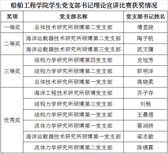 经过激烈角逐,比赛产生一等奖2名、二等奖4名、三等奖6名、优秀奖11名。总体技术研究所硕博第二党支部书记傅昱晓以《潜心钻研 逐梦深蓝 肩负时代使命 发出船海最强音》为题的理论宣讲获得员工党支部书记理论宣讲比赛一等奖,总体技术研究所硕博第二党支部员工党员邓清文以《“梦想”启航,牢记嘱托扬波深海》为题的演讲获得员工党员演讲比赛一等奖。