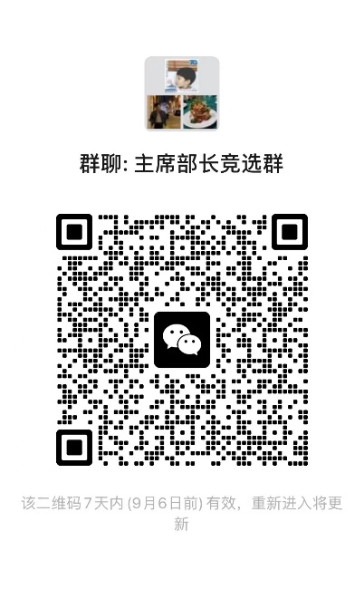 有意愿竞选主席及各部门部长职务的员工请于9月1日12:00前将电子版竞选表(详情见附件)发送至双创中心邮箱,并扫描下方二维码加“主席部长竞选群”,暂定9月1日下午在船海楼进行线下答辩,具体时间地点待定。