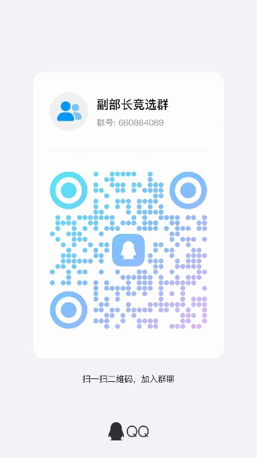 有意愿竞选各部门副部长职务的员工请于9月3日12:00前将电子版竞选表(详情见附件)发送至双创中心邮箱,并扫描下方二维码加“副部长竞选群”,暂定9月4日下午在船海楼进行线下答辩,具体时间地点待定。